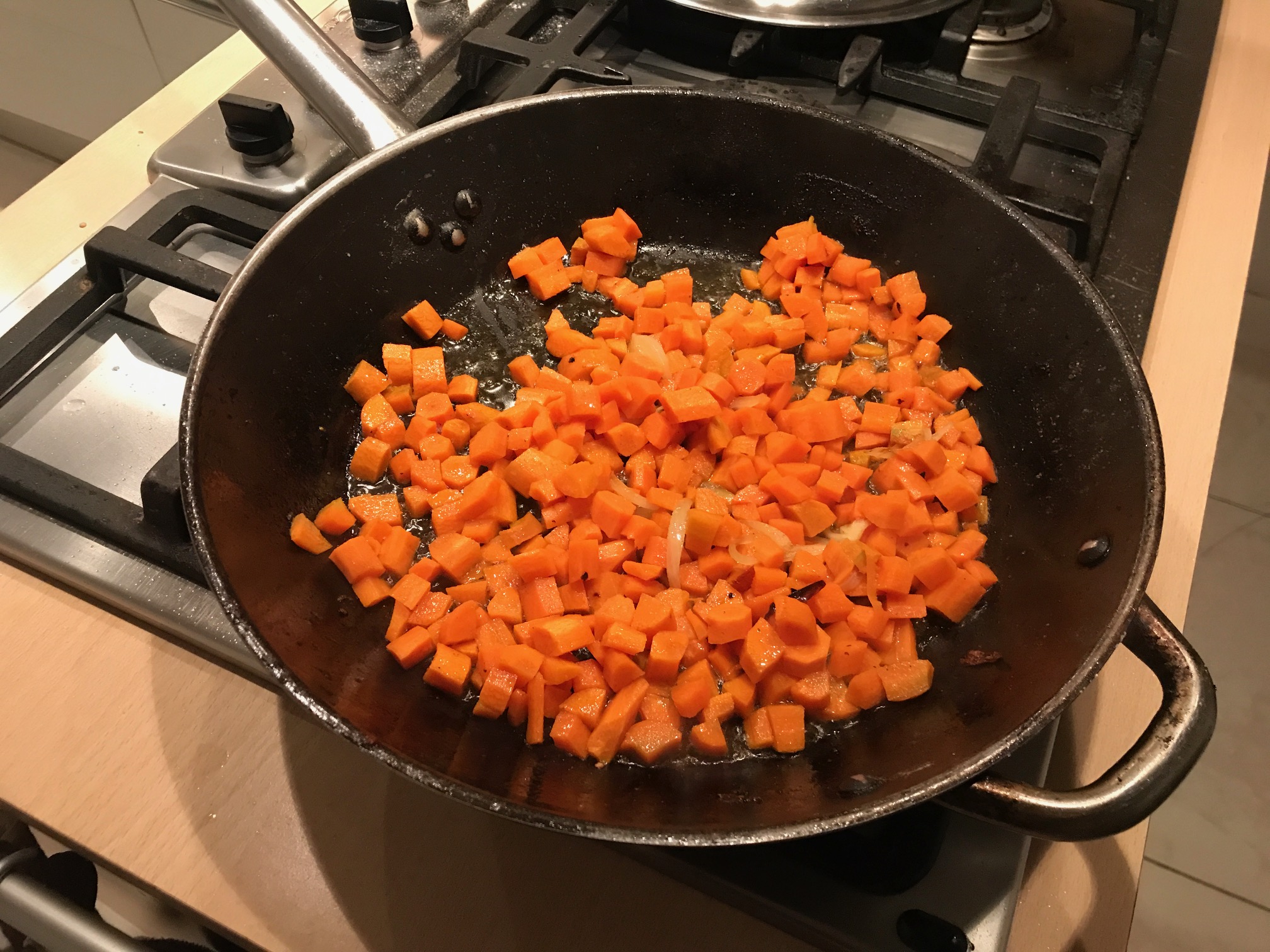 Ingredienti: 200gr di cous cous, 1/2 kg di carote, 100gr di pinoli, olio extravergine di oliva, 1 ciuffo di basilico, 1/2 cipolla, sale.