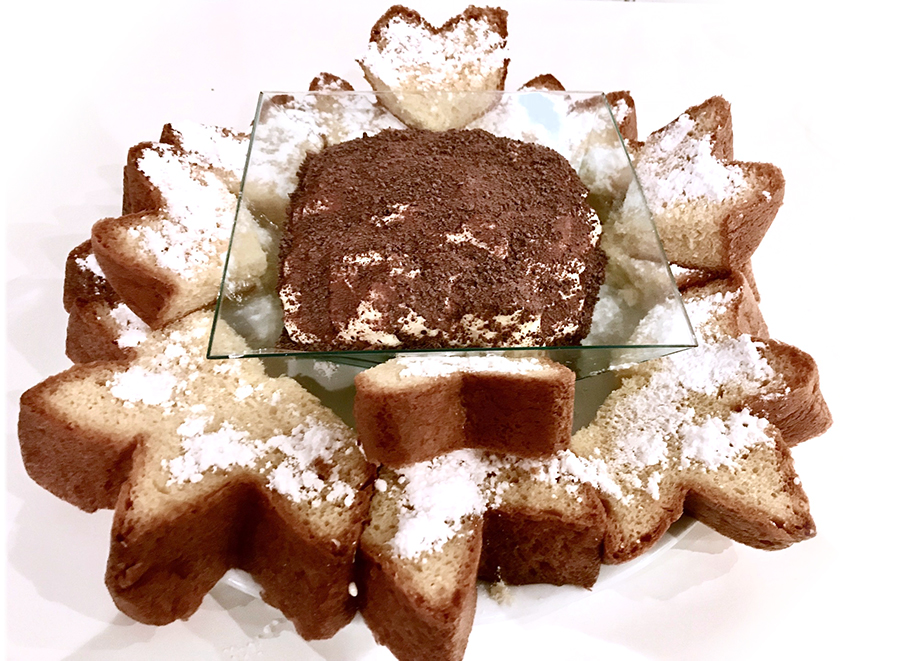 Aggiungere un altro strato di pandoro a stella e terminare con una bella colata di crema al mascarpone e una spolverata di cacao in plvere.