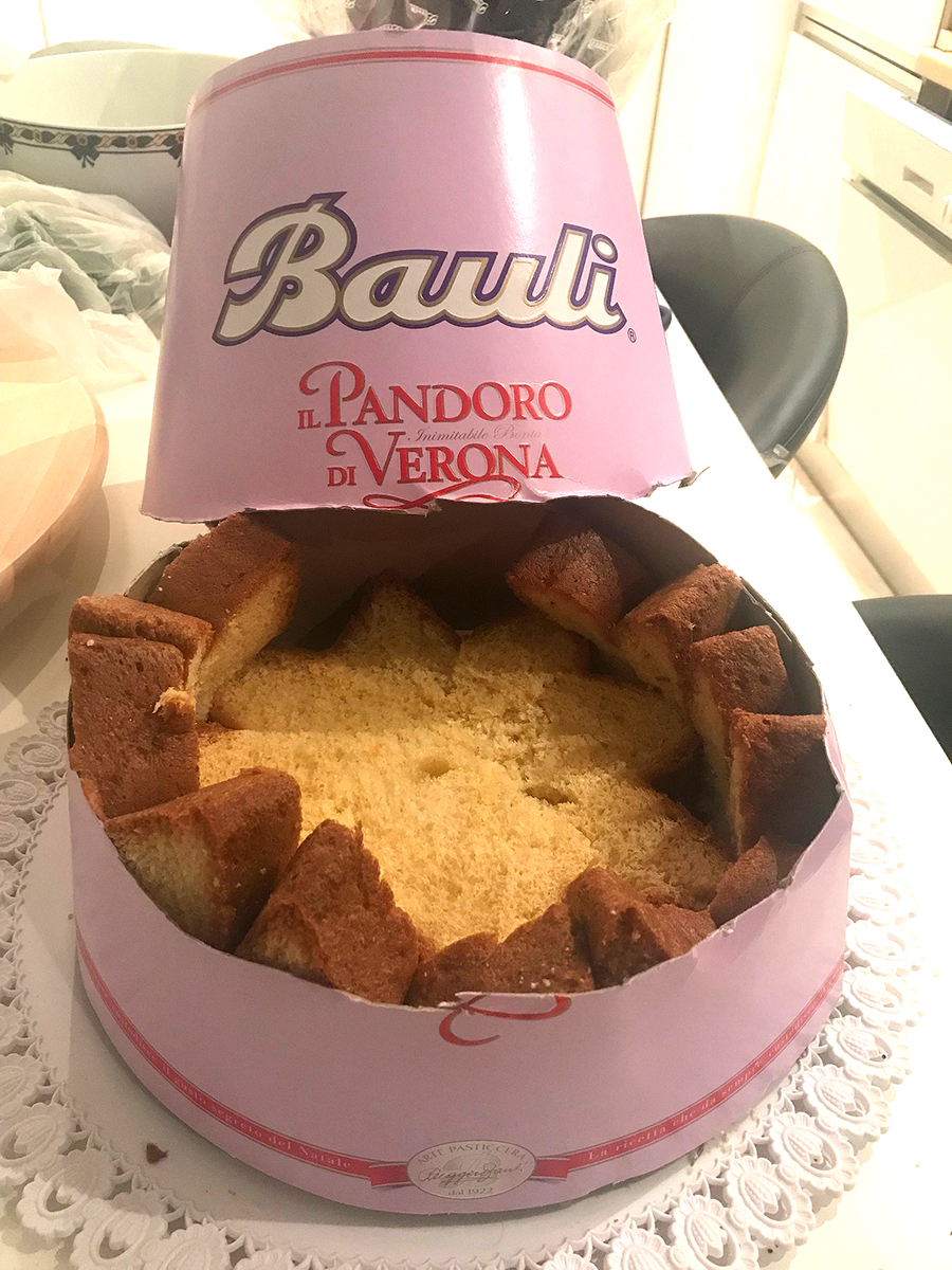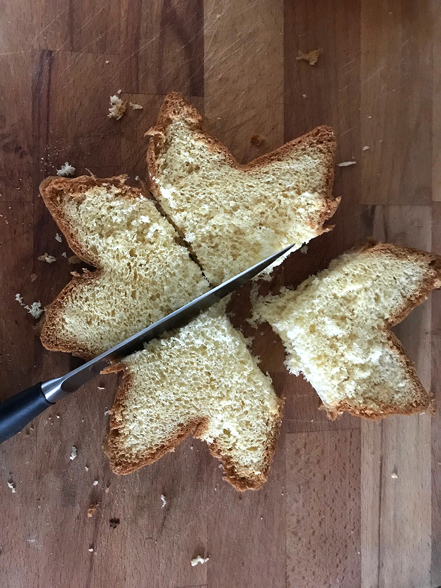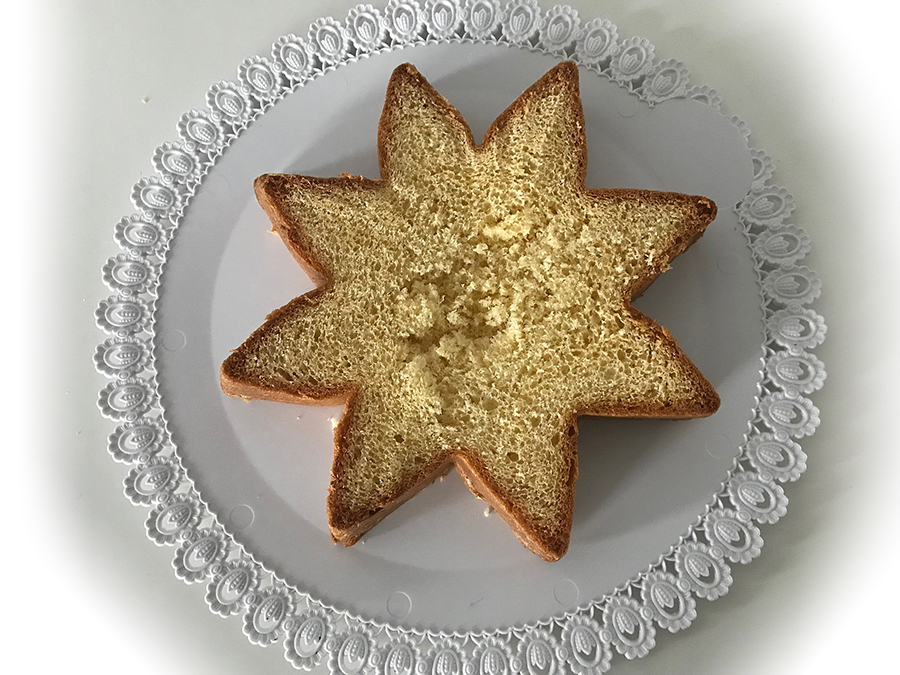 Esecuzione: Tagliare orizzontalmente il pandoro in fette alte 3cm circa a forma di stella facendo attenzione a eliminare lo strato di fondo.