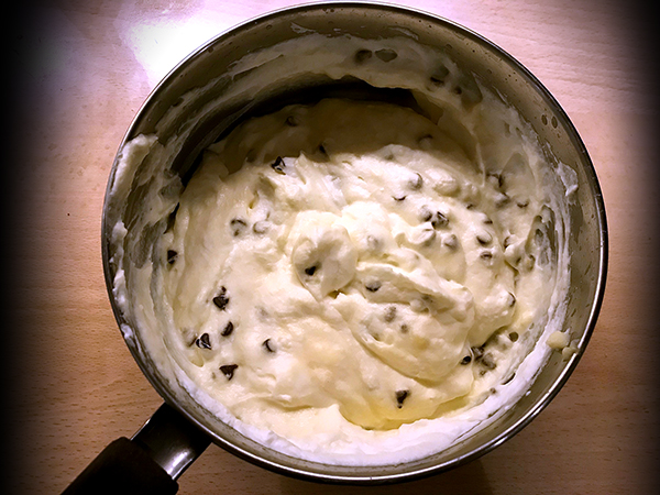 Bagnare leggermente le superfici interne del pandoro con il rum e mettere uno strato di crema al mascarpone con l’aggiunta di gocce di cioccolato.