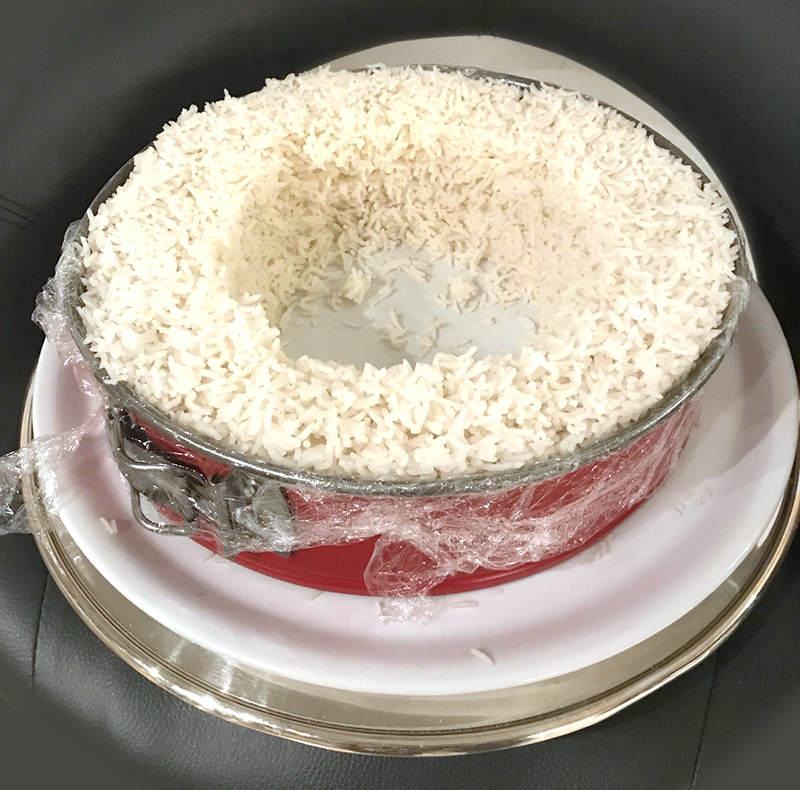 Lessare il riso pilaf con l’aggiunta di un cuchiaio di olio nell’acqua, e appena cotto e scolato, versarlo in uno stampo da torta rivestito con la pellicola. Aspettare che si raffreddi un po’ e scavare nel centro formando un vuoto a forma cilindrica per inserire all’ultimo la crema riscaldata.